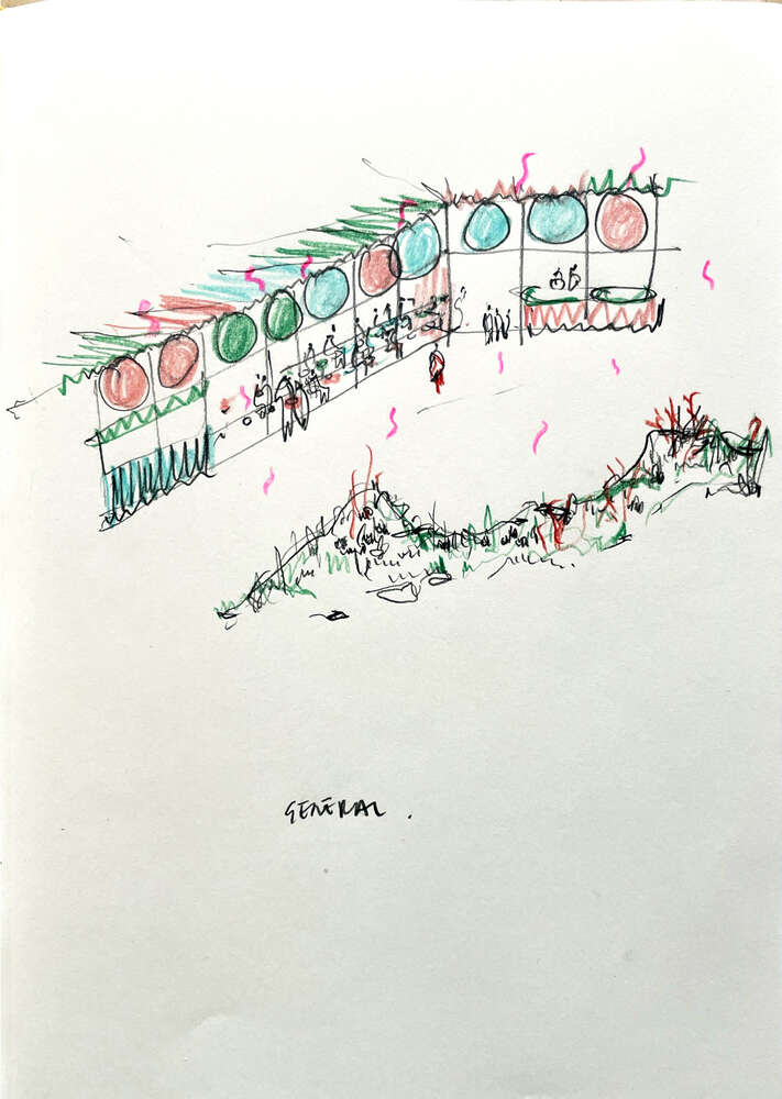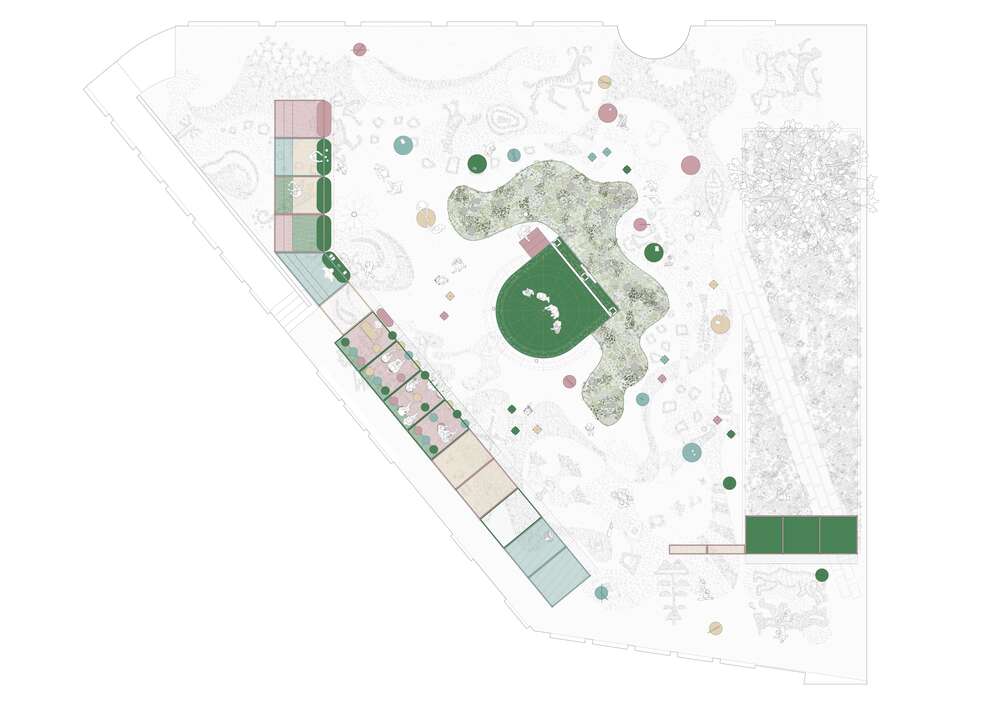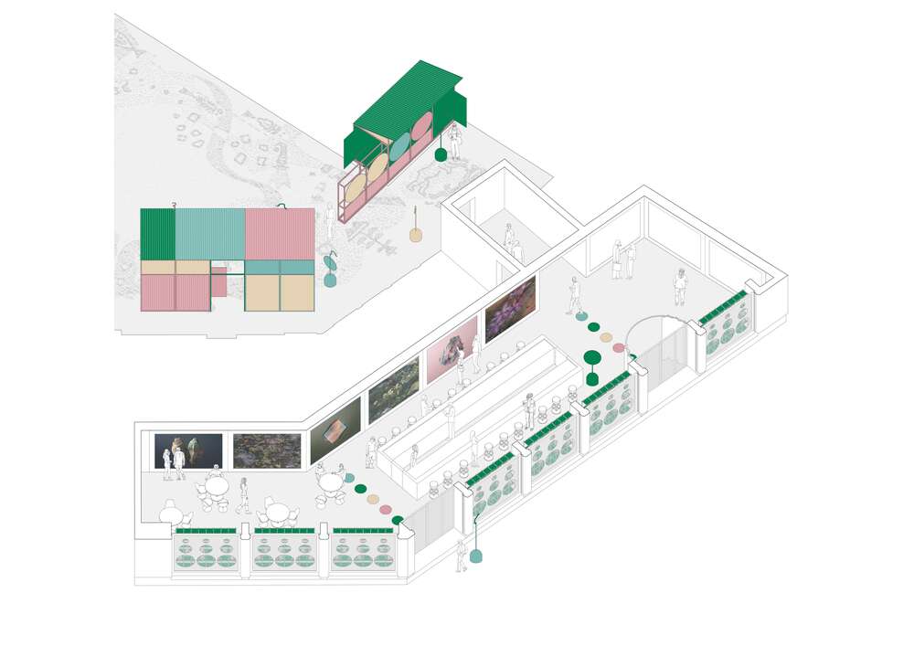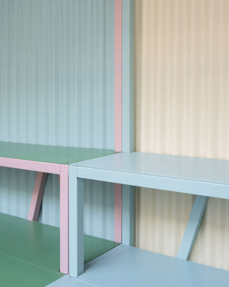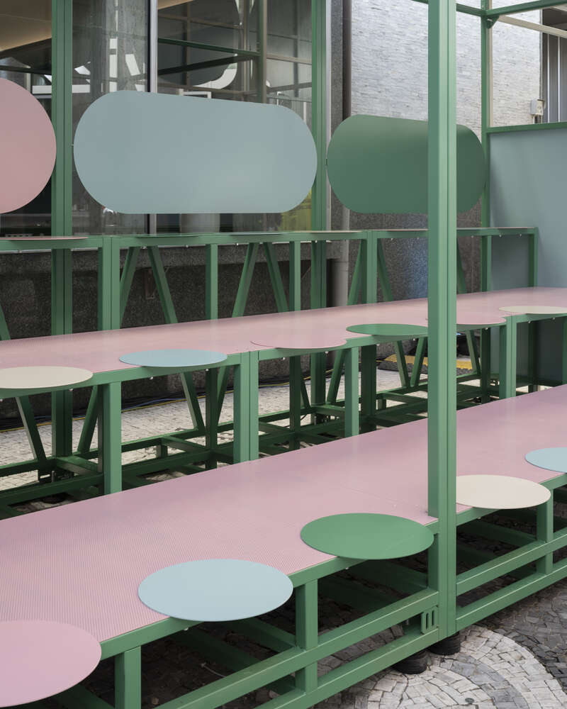 House of Switzerland is a garden. For a short moment, two weeks, it will be the center of a variable community that comes to celebrate the games or just to hung around and live this singular moment in the center of Milano before they find another place to stay. This other life is imbedded in the design process. The garden-house proposes a certain mood, rather gay, for a welcoming moment. Precis décor and patterns, colored modules that host diverse functions: stage, tribunes, bleachers, kiosks, market stalls. Other freely drawn patterns become lighting features, supported by the famous Milano street panettones that the town knows so well. They are part of a family of furniture: seating stools, tables, signage support. The garden also develops inside, within the existing restaurant space, the Swiss Corner. The photographic artwork of Dylan Perrenoud embraces the visitor with a series of lightboxes showing mysterious rock pieces and composed flora universes coming from an ancient collection of slides of the 1980s. Facing the lightboxes, a collection of 140 potted physical flowers is displayed within the depth of the show windows. The existing character of the space helps to create a multiplicity of reflexions that are pushed further to the exterior façade where the relation to the street is redefined. Flora Alpina is designed for seamless adaptability, drawing inspiration from the vital role of flowers in sports, medicine, and culture. Plants are healing, plants and flowers are Olympic signatures, celebrative and discreet. They accompany medals and smiles of achievement. They help us rejoice, live and breathe.